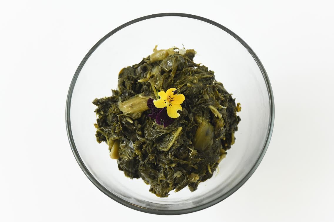 Ingredients: collard greens, butter (pasteurized cream, salt), sugar, red chili pepper flakes, salt (yellow prussiate of soda).